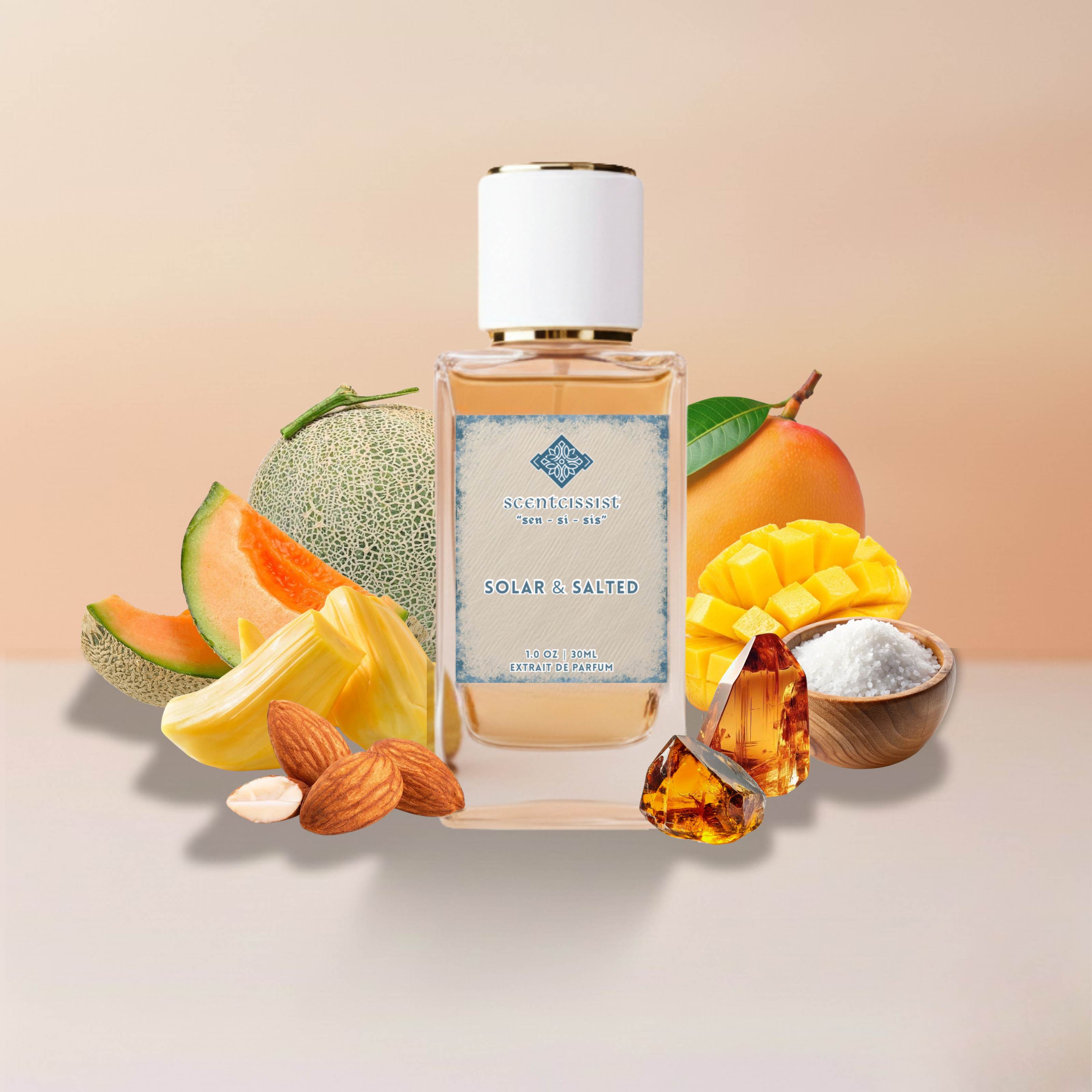 Juicy tropical fruits glow under warm sun, softened by a touch of salt and almond.